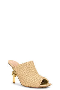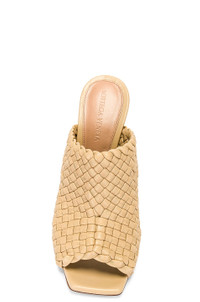 Details - Intreccio lambskin leather upper with bio-based, rubber-injected leather outsole - Made in Italy - Slip-on styling - Angled square open toe - Brass finish knotted heel - Approx 90mm/ 3.5 inch heel - Our Style No. BOTT-WZ488 - Manufacturer Style No. 754143-V2P50-2624