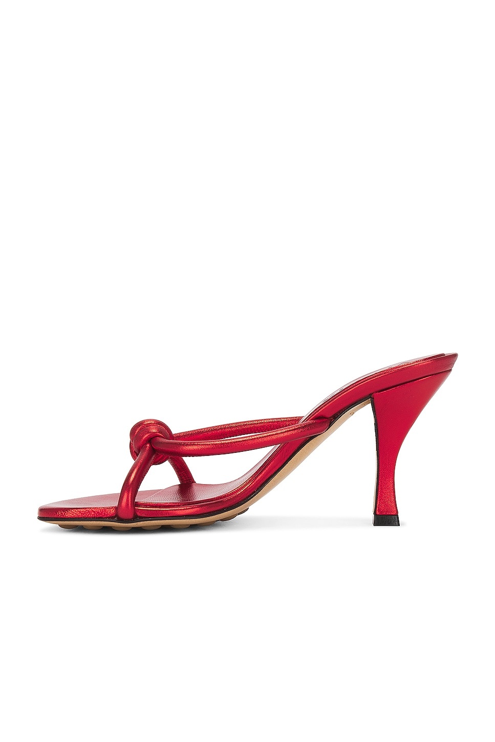Details - Laminated leather upper with leather and rubber sole - Made in Italy - Slip-on styling - Leather footbed and lining - Knotted detailing at straps - Rounded toe with subtle flare heel - Approx 83mm/ 3.25 inch heel - Our Style No. BOTT-WZ517 - Manufacturer Style No. 775418-V3P70-8822