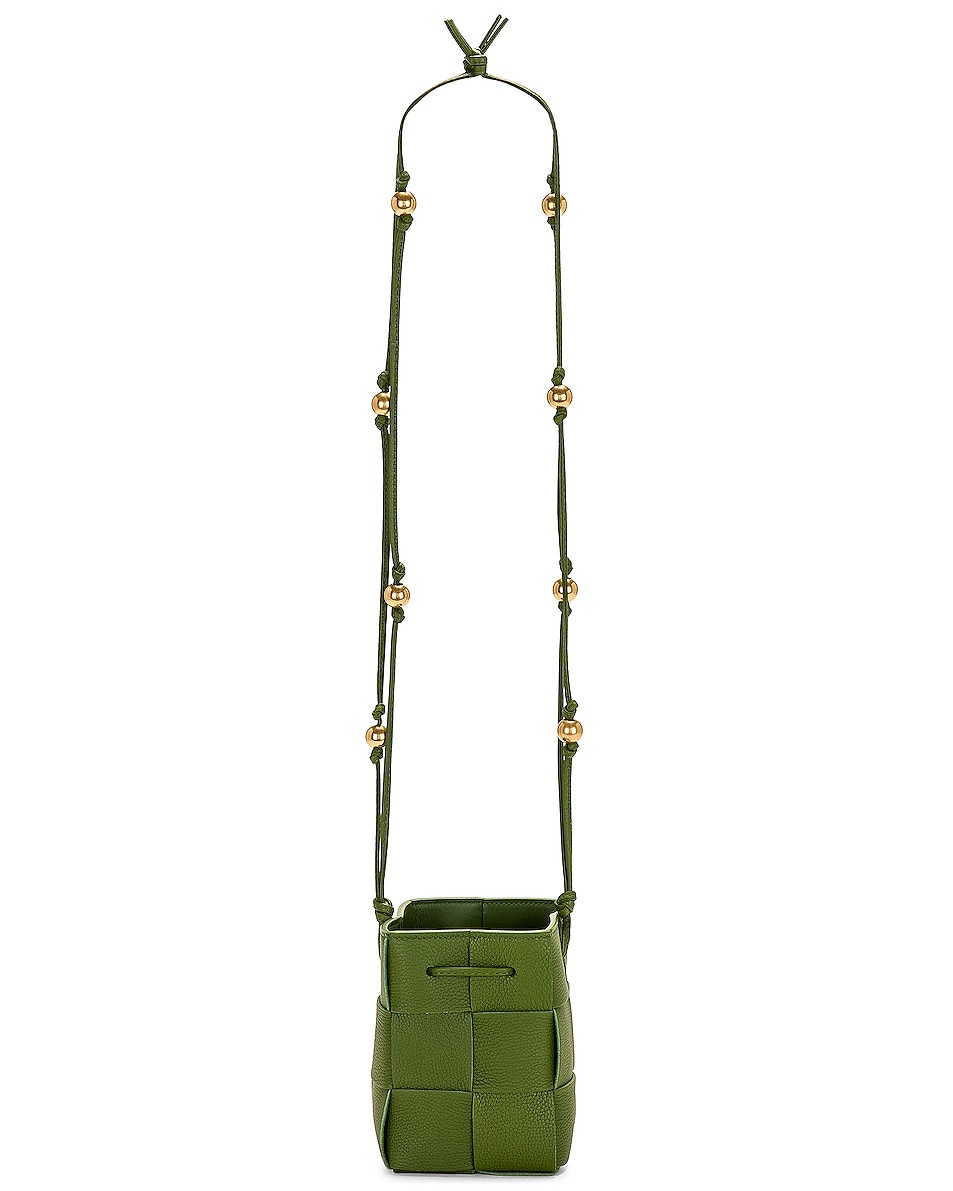 Details - Grained intreccio leather with smooth leather lining and aged gold-tone hardware - Made in Italy - Drawstring top closure - One main compartment - Knotted shoulder strap with hardware detail - Measures approx 4" W x 5.5" H x 4" D - Shoulder strap with a 19" drop - Our Style No. BOTT-WY1191 - Manufacturer Style No. 714605-VCP13-3141