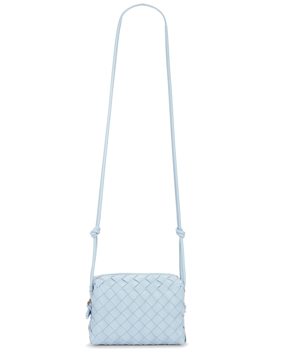 Details - Unlined intrecciato lambskin - Top zipper closure - One main compartment - Knotted detail at sides and shoulder strap - Measures approx 6.7" W x 4.3" H x 2.4" D - Shoulder strap with a 19.7" drop - Made in Italy - Our Style No. BOTT-WY1890 - Manufacturer Style No. 723547-V1G11-1729