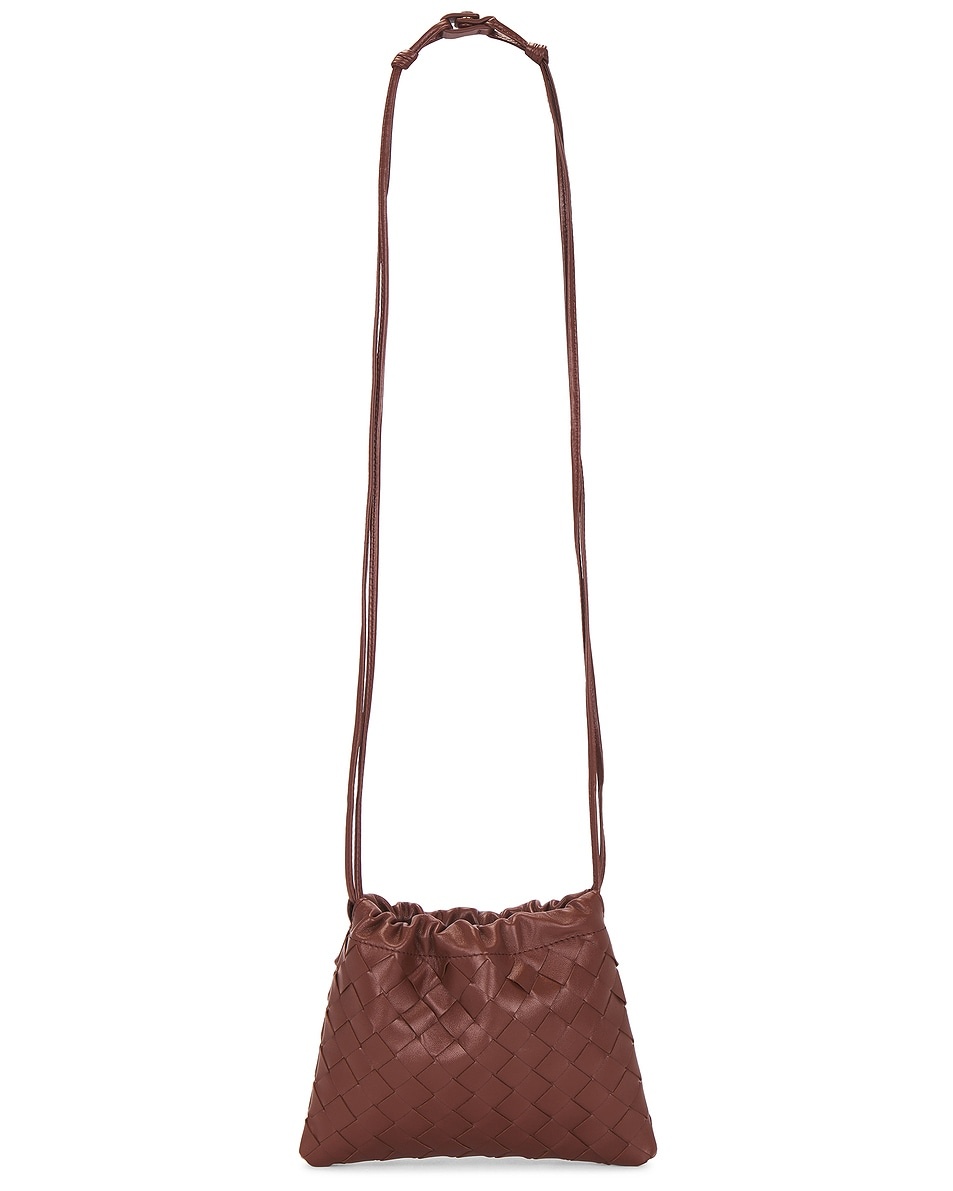 Details - Intrecciato calfskin exterior with ripstop lining - Made in Italy - Drawstring top closure - One main compartment - Measures approx 21 cm W x 17 cm H x 1 cm D - Shoulder strap with a 55 cm drop - Our Style No. BOTT-WY1845 - Manufacturer Style No. 816987-V3IV1-2504