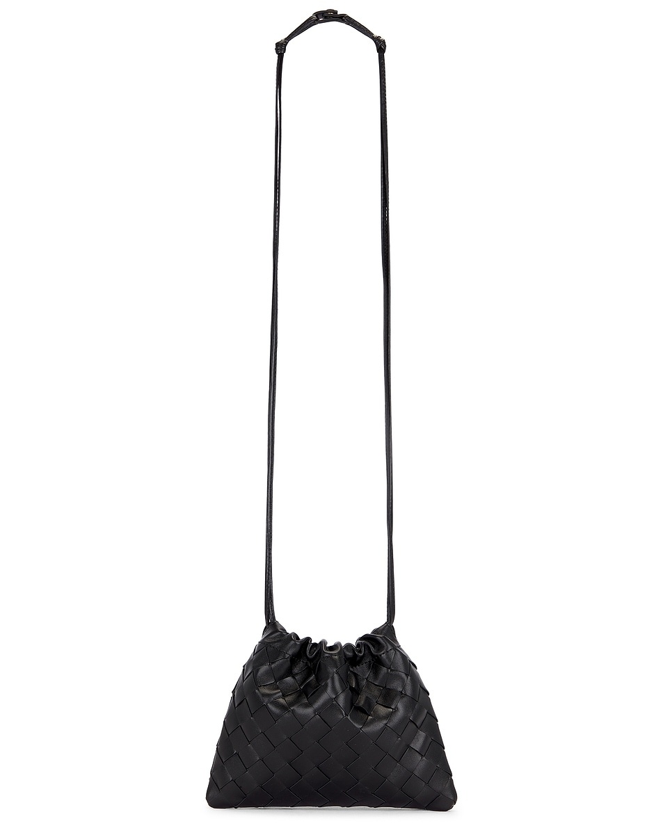 Details - Intrecciato leather exterior with textile lining - Made in Italy - Top drawstring closure - One main compartment - Integrated shoulder strap - Measures approx 20 cm W x 16 cm H x 3 cm D - Shoulder strap with a 43 cm drop - Our Style No. BOTT-WY1854 - Manufacturer Style No. 816987-V3IV1-8425