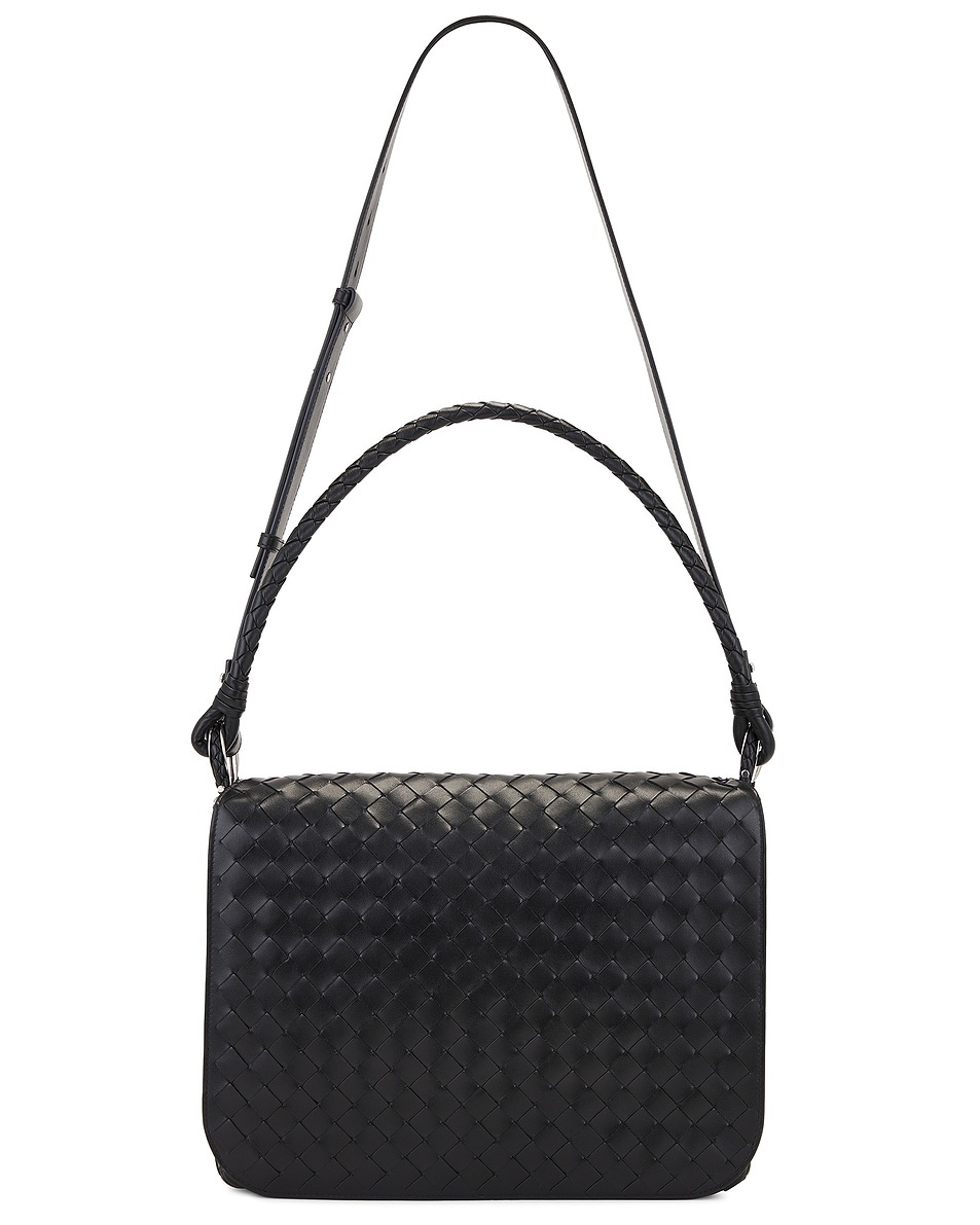 Details - Intrecciato leather exterior with canvas lining - Made in Italy - Flap top with dual magnetic closure - Interior zipper pocket - Dual slip pockets - Integrated braided shoulder strap - Detachable and adjustable leather crossbody strap - Measures approx 34 cm W x 24 cm H x 5 cm D - Shoulder strap with a 27 cm - 58 cm drop - Our Style No. BOTT-MY228 - Manufacturer Style No. 795074-V2HL1-1208