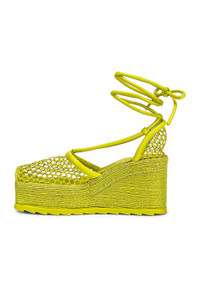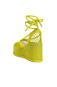 Details - Mesh and leather upper with rubber sole - Jute midsole - Made in Spain - Ankle wrap with tie closure - Leather and textile footbed with debossed Bottega Veneta logo detail - Square, flat toe - Approx 89mm/ 3.5 inch wedge - Our Style No. BOTT-WZ302 - Manufacturer Style No. 689536 V1O01 7278