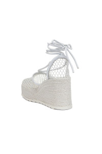 Details - Mesh and leather upper with rubber sole - Textile midsole - Made in Spain - Ankle wrap with tie closure - Leather and textile footbed with debossed Bottega Veneta logo detail - Square, flat toe - Approx 89mm/ 3.5 inch wedge - Our Style No. BOTT-WZ276 - Manufacturer Style No. 689536 V1O01 9122