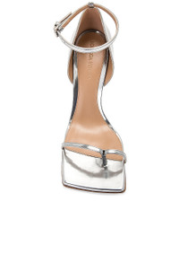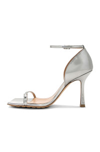 Details - Metallic lambskin leather upper with rubber-injected leather sole - Made in Italy - Ankle strap with buckle closure - Toe loop - Lambskin leather lining - Square toe with block heel - Approx 95mm/ 3.75 inch heel - Our Style No. BOTT-WZ410 - Manufacturer Style No. 729742-V2BG0-1414
