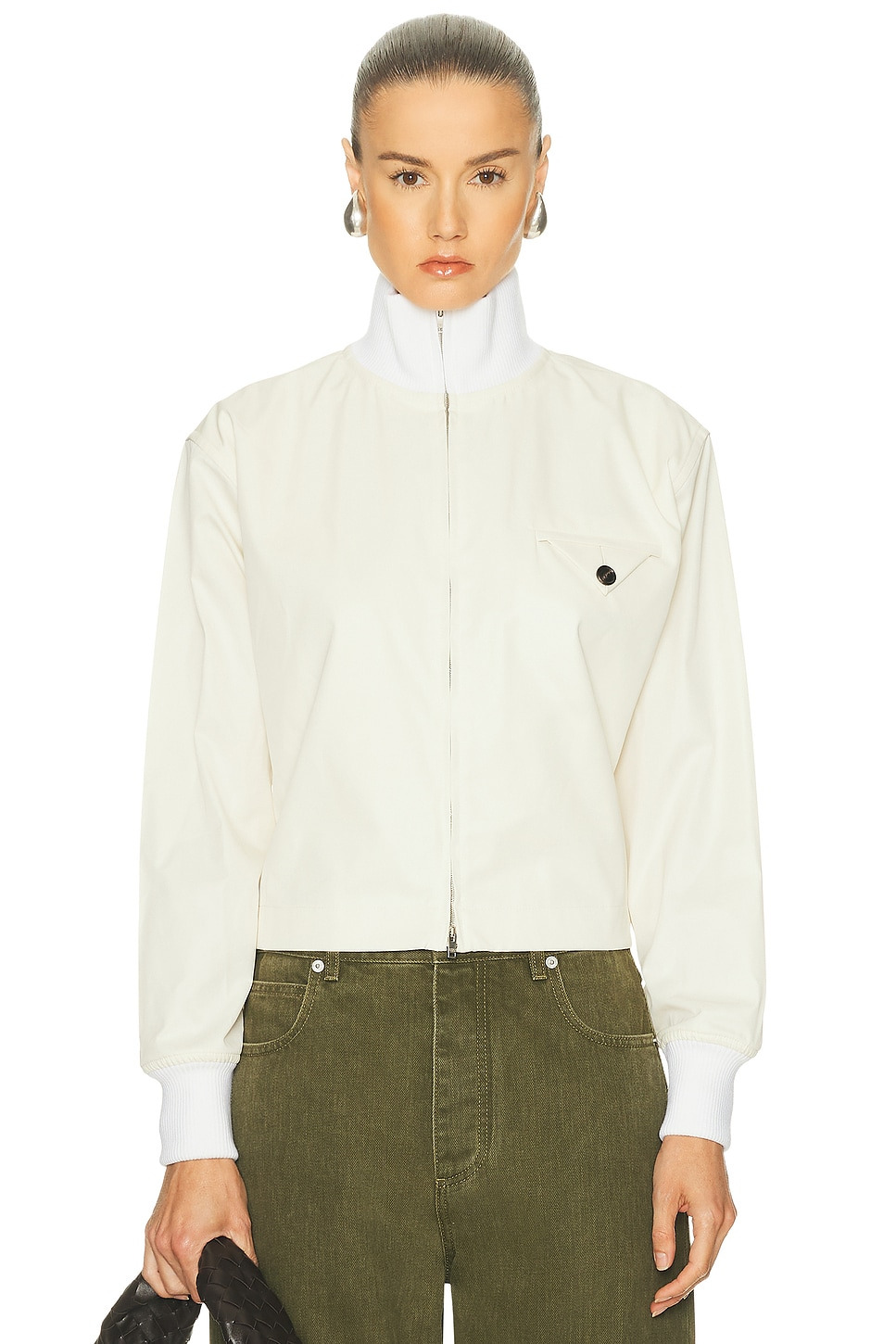 Details - Self 1 & Lining: 100% cotton - Self 2: 82% wool, 15% polyamide, 3% elastane - Dry clean only - Hidden front zipper closure - Breast seam pocket with button detail - Stand collar styling - Ripstop fabric with ribbed knit fabric - Made in Italy - Our Style No. BOTT-WO72 - Manufacturer Style No. 838232-V4CS0-3043