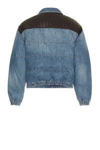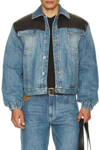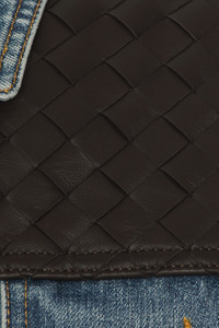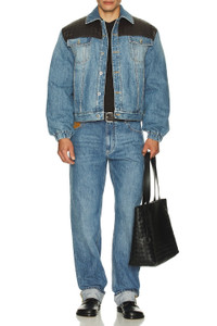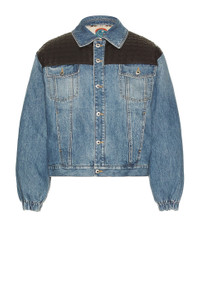 Details - Self: 100% cotton - Lining: 65% polyester, 35% cotton - Contrast Fabric: 100% leather - Dry clean only - Front button closure - Front slant pockets - Chest button pockets - Woven leather accent - Intentional fading and light whiskering - Heavyweight denim fabric - Made in Italy - Our Style No. BOTT-MO51 - Manufacturer Style No. 833896-V42W0-4715