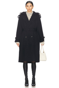 Details - 100% cotton - Made in Italy - Dry clean only - Double-breasted front button closure - Hoodie with adjustable drawstring - Epaulettes at cuff and optional belt and waist - Side slant pockets - Our Style No. BOTT-WO52 - Manufacturer Style No. 784057-V4C50-4246
