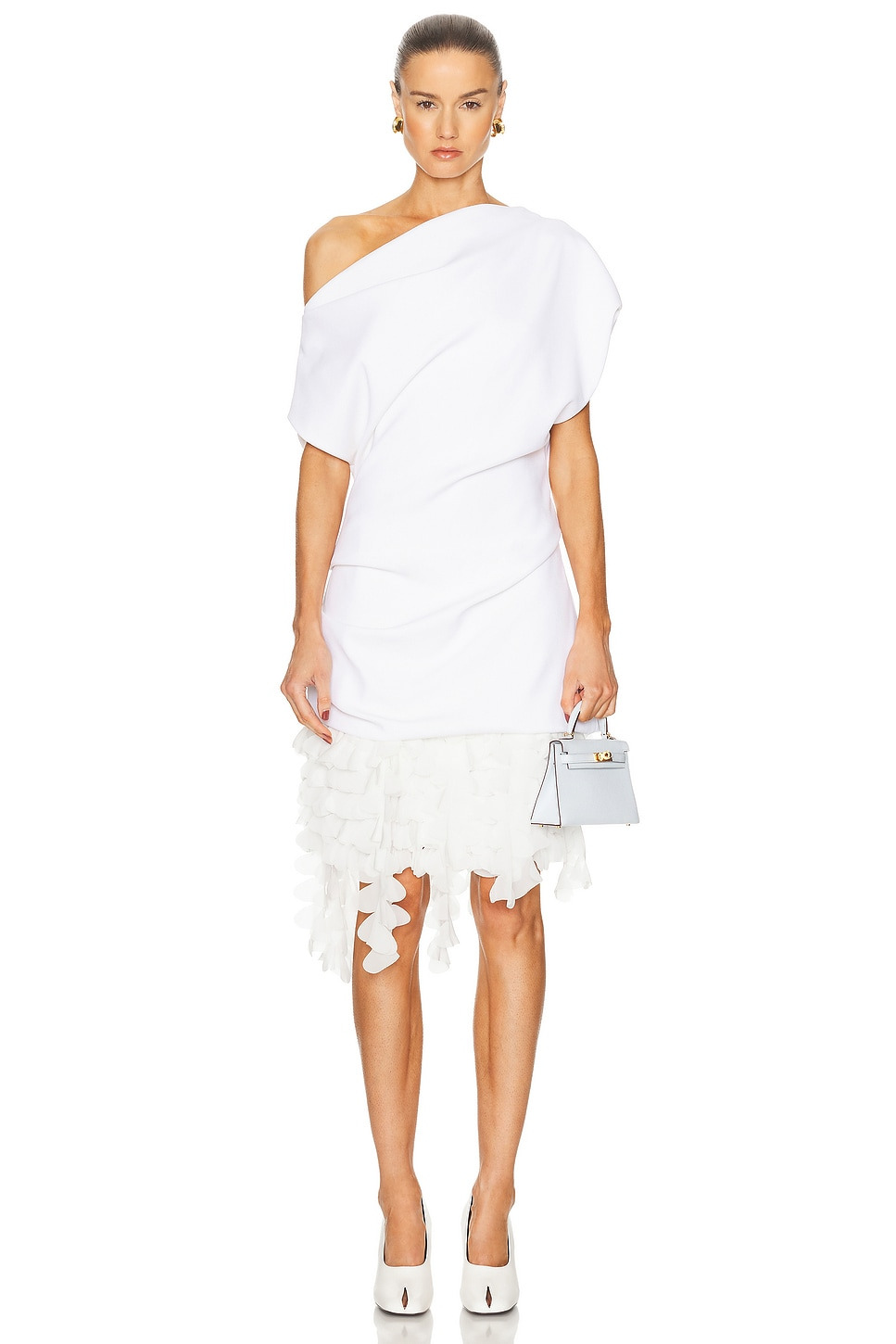 Details - Self 1: 86% viscose, 13% polyamide, 1% elastane - Self 2: 100% silk - Self 3: 100% polyester - Dry clean only - Fully lined - Hidden side zipper closure - Removable slip with petal design - Twill fabric - Made in US - Our Style No. BMAX-WD95 - Manufacturer Style No. DR765SS25