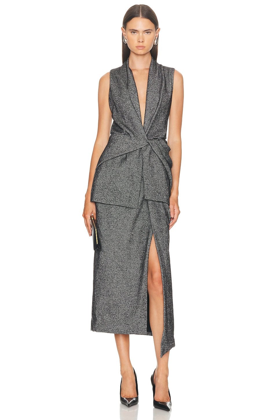Details - Self: 86% virgin wool, 14% polyamide - Lining: 100% polyester - Dry clean only - Fully lined - Hidden back zipper closure - Deep V-neckline - Gathered fabric at front waist - Heavyweight twill fabric with front slit - Made in US - Our Style No. BMAX-WD86 - Manufacturer Style No. DR654FW24