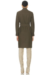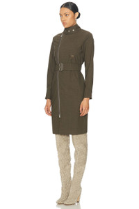 Details - Self: 95% wool, 5% elastane - Pocket Lining: 100% viscose - Made in Poland - Dry clean only - Unlined - Exposed front zipper closure - Wraparound snap button closure at collar - Optional tonal belt at waist - Buttoned cuffs - Our Style No. BURF-WD69 - Manufacturer Style No. 8095101