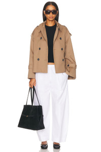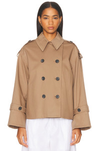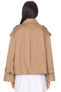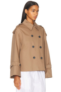Details - Self: 50% organic cotton, 48% cotton, 2% elastane - Lining: 100% viscose - Dry clean only - Front double-breasted button closure - Epaulettes and belted cuffs - Side slit pockets - Twill fabric - Made in Lithuania - Our Style No. BYMF-WO7 - Manufacturer Style No. 102499