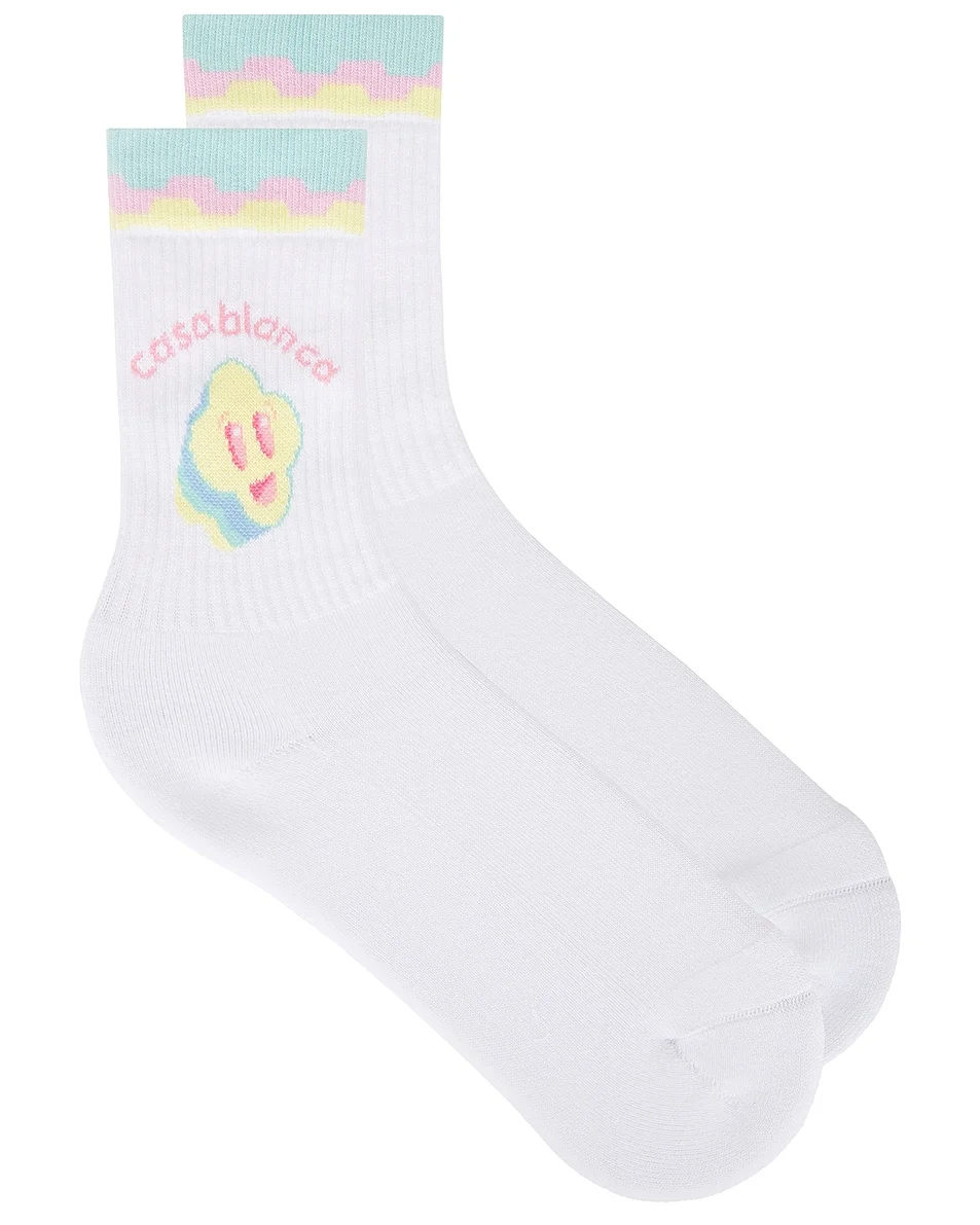 Details - 86% recycled cotton, 13% polyamide, 1% elastane - Made in Portugal - Delicate machine wash - Smiley face graphic - Staggered stripe edge detail - Rib legs - Signature Casablanca logo - Our Style No. CBLN-WA46 - Manufacturer Style No. A-SP26-ACC-010-04