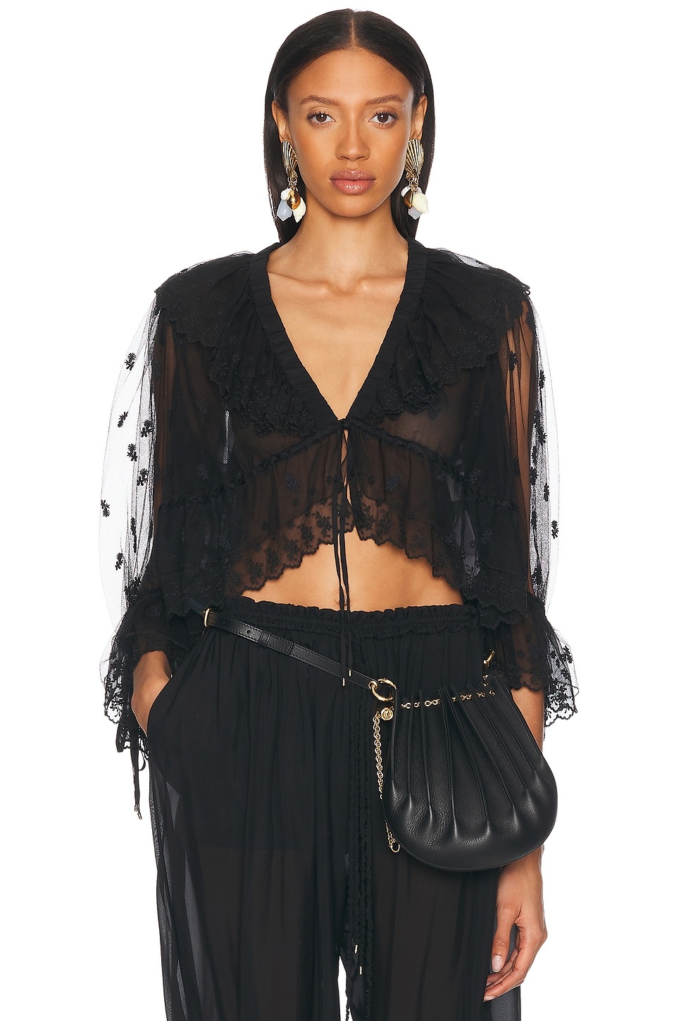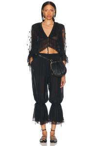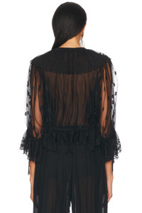 Details - Self: 1: 100% polyester - Self 2: 53% polyester, 47% silk - Self 3: 100% silk - Dry clean only - Singular front button and tie closures - Tie-up accent at cuffs - Tulle fabric with ruffle detail - Garment is made with a semi-sheer fabric, undergarments can show through - Made in Madagascar - Our Style No. CLOE-WS224 - Manufacturer Style No. 25UHT26099