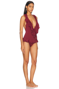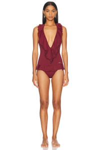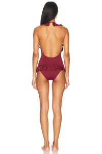 Details - Self: 82% polyamide, 18% elastane - Lining: 83% polyamide, 17% elastane - Made in Italy - Hand wash - Halterneck S-hook closure - Front plunging V-neckline - Front gold-tone logo hardware - Ruffle detail and open back design - Our Style No. CLOE-WX28 - Manufacturer Style No. 25UMB19473