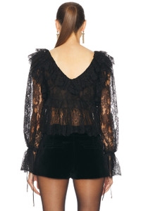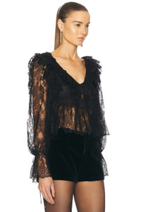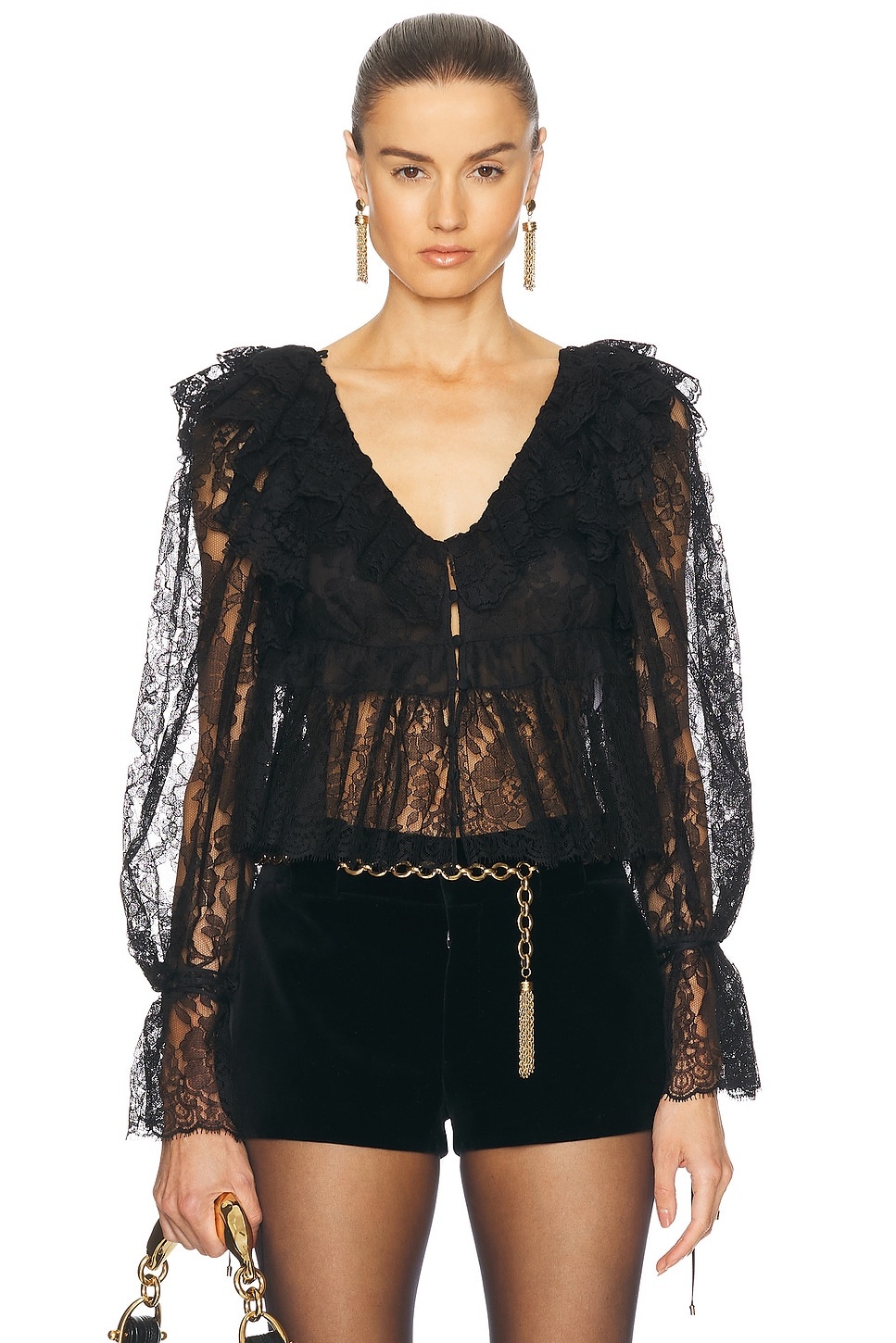 Details - Self 1: 60% cotton, 40% polyamide - Self 2: 77% cotton, 23% polyamide - Lining: 68% acetate, 32% silk - Made in Madagascar - Dry clean only - Front button loop closure - Deep V-neckline at front and back - Tie-up detail at cuffs - Lace fabric with ruffle detail - Garment is intentionally sheer, undergarments will show through - Our Style No. CLOE-WS219 - Manufacturer Style No. 25SHT15400