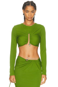 Details - Self: 96% polyester, 4% spandex - Hardware: copper and natural stone - Dry clean only - Pull on styling - Unpadded - Ruched cut out detail at chest with copper and stone hardware - Ribbed knit material - Made in Vietnam - Our Style No. CHRF-WS206 - Manufacturer Style No. 25021380
