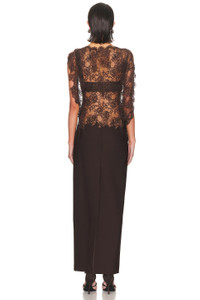 Details - Self: 43% wool, 28% viscose, 27% polyester, 2% lyocell - Lining: 100% viscose - Contrast Fabric: 50% nylon, 50% polyester - Dry clean only - Partially lined - Hidden side zip closure - Detachable bralette with hook and bar closure - Back vent - Midweight crepe fabric with lace bodice - Garment is intentionally sheer, undergarments will show through. - Made in Vietnam - Our Style No. CHRF-WD347 - Manufacturer Style No. 25043299