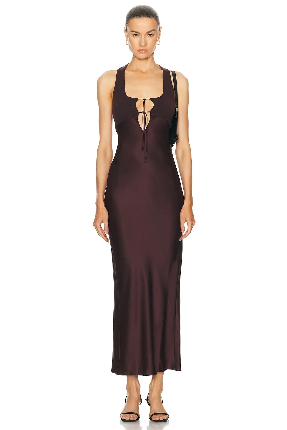Details - Knit and satin textile - Imported - Dry clean recommended - Unlined - Pull-on styling - Knit bodice with adjustable tie - Our Style No. CHRF-WD237 - Manufacturer Style No. 24023094