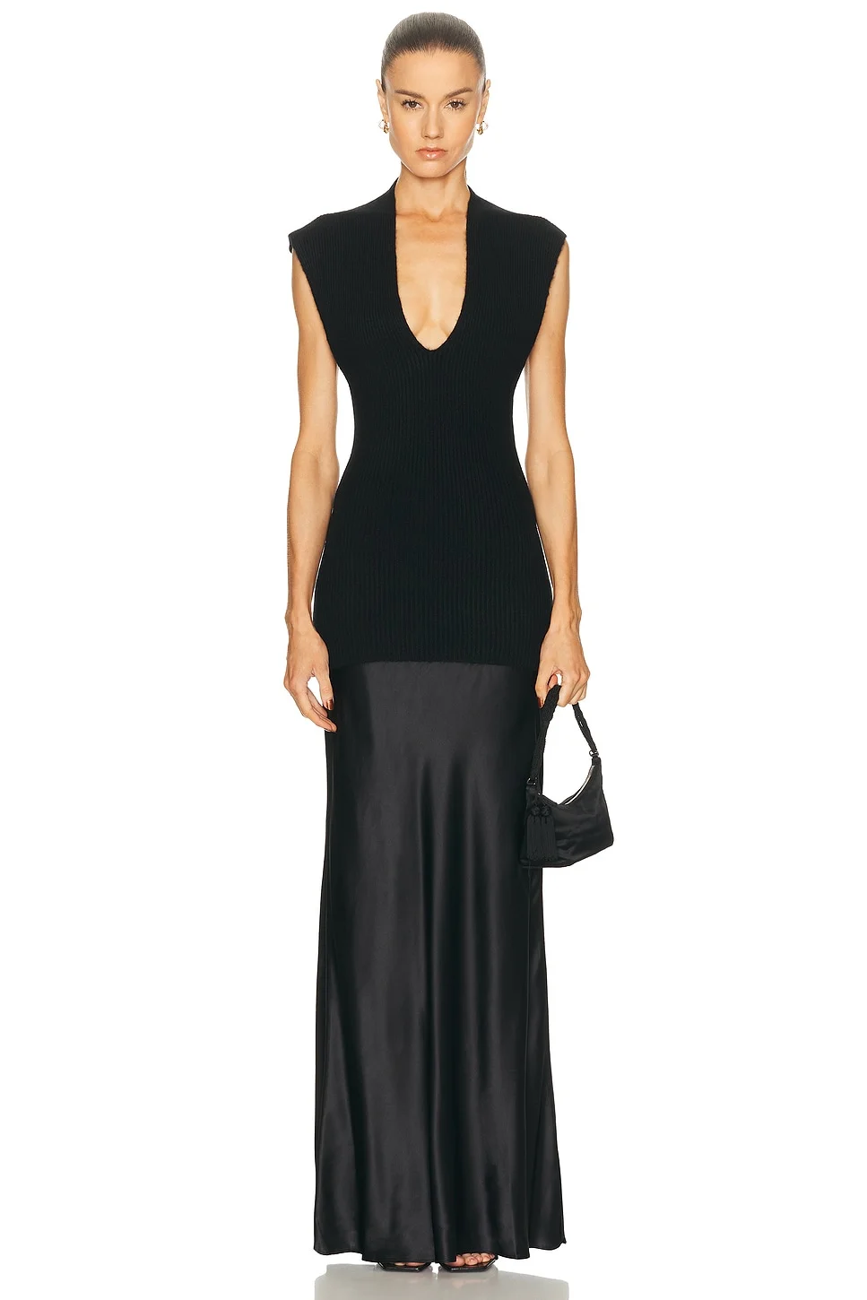 Details - Self 1: 100% cashmere - Self 2: 100% silk - Made in India - Dry clean only - Unlined - Pull-on styling - Lightweight knit textile bodice with contrast satin skirt - Deep-V neckline - Our Style No. CHRF-WD338 - Manufacturer Style No. 25033744