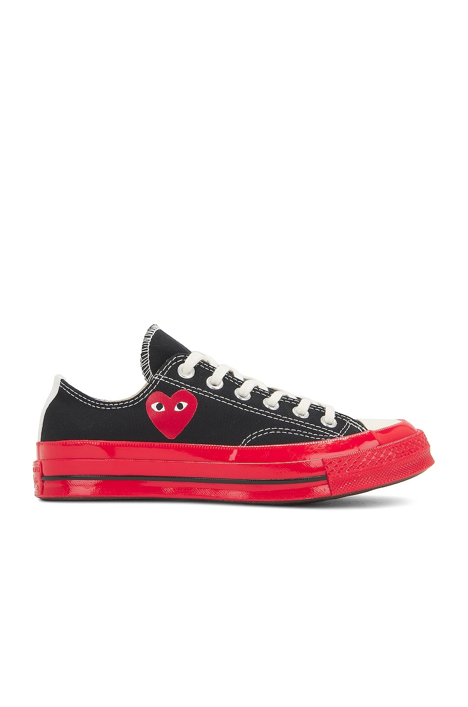 Details - Comme Des Garcons x Converse - Canvas upper with rubber sole - Made in Vietnam - Lace-up front - Hi-shine toe cap and sidewall - PLAY logo at side - Contrast midsole - Chuck Taylor All Star license plate at heel - Our Style No. CDES-UZ28 - Manufacturer Style No. P1K123