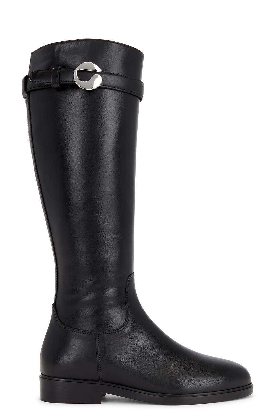 Details - High gloss leather upper and sole - Made in Spain - Side zipper closure - Buckle strap with crescent silver-tone metal hardware - Round toe - Block heel - Approx 25mm/ 1 inch heel - Approx 381mm/ 15 inch shaft - Shaft measures approx 44 cm in circumference - Our Style No. CRNF-WZ50 - Manufacturer Style No. COPSH67857