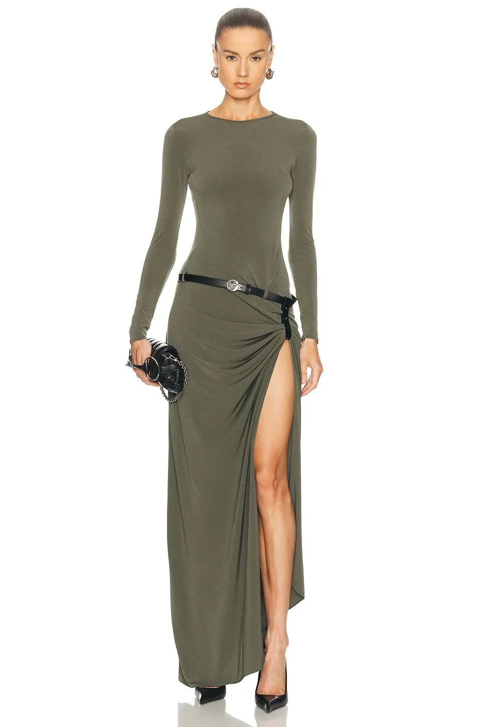 Details - 95% polyester, 5% elastane - Machine wash - Unlined - Pull-on styling - Detachable belt with silver-tone logo buckle - Ruched side with slit - Heavyweight jersey fabric - Made in France - Our Style No. CRNF-WD106 - Manufacturer Style No. COPR223F5022