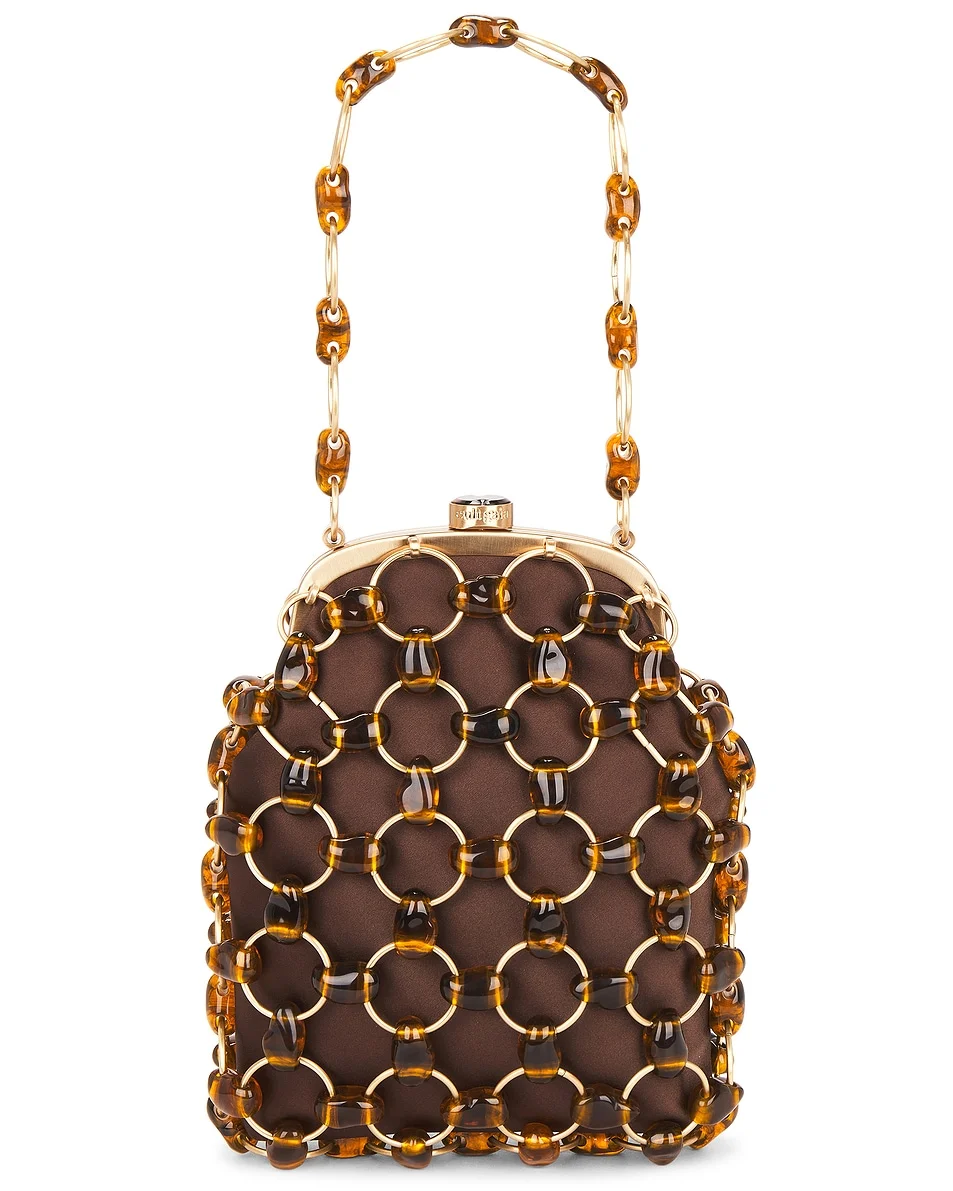 Details - Open gold-tone ring with beadwork embellishment overlay polyester exterior with satin lining - Made in China - Push-lock closure - One main compartment - Measures approx 15 cm W x 19 cm H x 4 cm D - Top handle with a 13 cm drop - Our Style No. GAIA-WY177 - Manufacturer Style No. WL2579LR3201