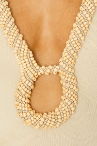 Details - Self: 79% viscose, 21% nylon - Trim: 100% wood - Made in China - Hand wash - Unlined - Pull-on styling - Plunging front neckline with cut-out detail - Knit fabric with wood beaded detail at neckline - Our Style No. GAIA-WD294 - Manufacturer Style No. KD3842YN2611