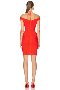 Details - 75% viscose, 23% nylon, 2% elastane - Made in China - Hand wash - Unlined - Halterneck tie-up closure - Off-shoulder styling - Lightweight ponte-knit fabric with ruching detail - Our Style No. DAVF-WD418 - Manufacturer Style No. RE25DKKN02D
