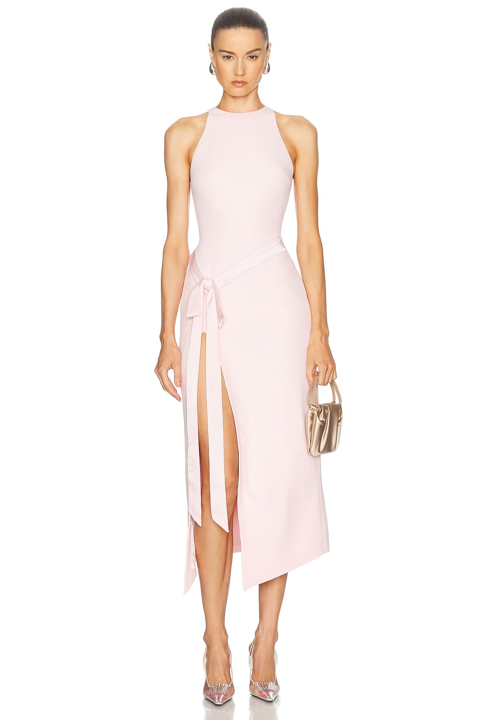 Details - Self 1: 50% viscose, 47% acetate, 3% elastane - Self 2: 78% triacetate, 22% polyester - Lining: 84% viscose, 36% polyester - Made in United Kingdom - Dry clean only - Fully lined - Hidden back zipper closure - Bow detail at waist - Crepe fabric with front slit - Our Style No. DAVF-WD396 - Manufacturer Style No. PF24DK01D
