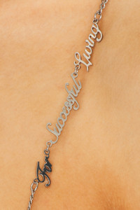 Details - Self: 100% polyester - Contrast Fabric: 100% steel - Made in Italy - Hand wash - Partially lined at bust - Pull-on styling - Adjustable silver-tone chain shoulder straps with slogan detailing - Midweight satin fabric - Our Style No. DIEF-WD54 - Manufacturer Style No. A14385-0QJAR