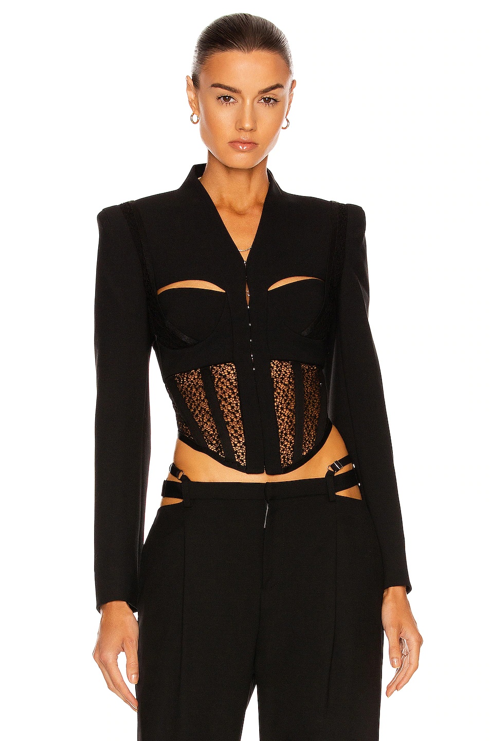 Details - Self: 53% poly, 43% virgin wool, 4% elastane - Contrast Fabric: 51% viscose, 32% elastane, 16% polyamide, 1% polyamide organza - Lining: 100% cupro - Made in China - Dry clean only - Front hook and eye closures - Corset-style bodice & lace paneling - Cut for a tailored silhouette from a lightweight compact wool & custom web lace - Cut-out above the bust & dipped hem - Lightly padded shoulders - Our Style No. DION-WO9 - Manufacturer Style No. A4178P21