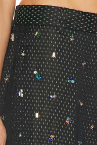 Details - 100% viscose - Made in India - Dry clean - Zip fly with hook-and-bar closure - 4-pocket styling - Satin textile - Gemstone embellishments throughout - Our Style No. DRNF-WP20 - Manufacturer Style No. 252-010957-2350