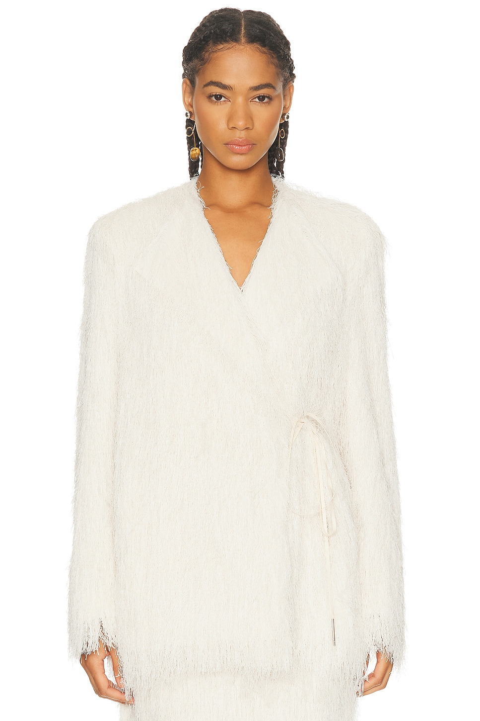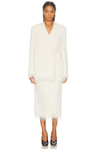 Details - Self: 100% polyester - Lining: 100% viscose - Dry clean only - Wrap around tie closure - V-neck design - Padded shoulders - Heavyweight satin fabric with fringe overlay - Item not sold as a set - Made in Poland - Our Style No. DRNF-WO14 - Manufacturer Style No. 252-010263-2031