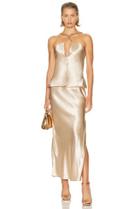 Details - 100% viscose - Made in Italy - Dry clean only - Keyhole cut-out at front - Detachable gold-tone twisted shoulder straps - Satin finish with side seam slit - Item not sold as a set - Our Style No. FGAF-WS4 - Manufacturer Style No. 770573