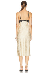 Details - Self 1: 100% silk - Self 2: 49% polyamide, 28% cotton, 23% lyocell - Dry clean only - Unlined - Hidden side zipper closure - Adjustable shoulder straps - Printed charmeuse fabric with lace accent - Made in China - Our Style No. FLEF-WD138 - Manufacturer Style No. DR0623