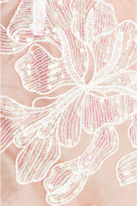 Details - Self: 100% nylon - Made in China - Hand wash - Partially lined - Hidden side zipper closure - Sequin embellished floral design throughout - Lightweight mesh fabric - Our Style No. FLEF-WD114 - Manufacturer Style No. DR0528