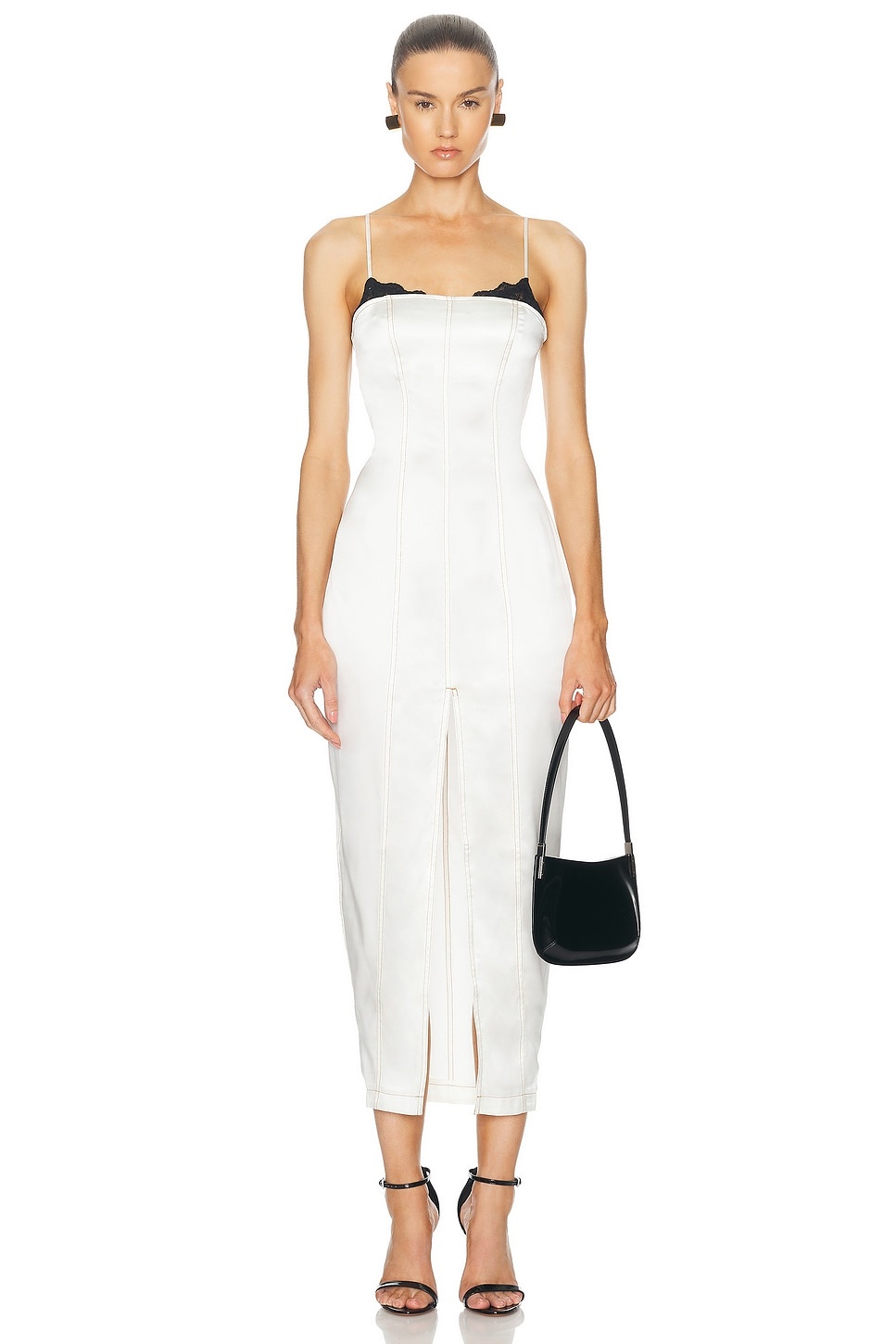 Details - 100% silk - Made in China - Dry clean only - Lined bust - Hidden side zipper closure - Adjustable shoulder straps - Front slit - Satin fabric with lace bust trim - Our Style No. FLEF-WD122 - Manufacturer Style No. DR0551