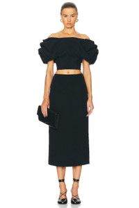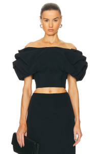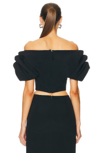 Details - Self: 73% silk, 27% wool - Lining: 100% silk - Made in Italy - Dry clean only - Back zipper closure - Boned corset lining - Off-the-shoulder ruched puff sleeves - Crepe fabric - Our Style No. GABF-WS4 - Manufacturer Style No. 3241049-S089
