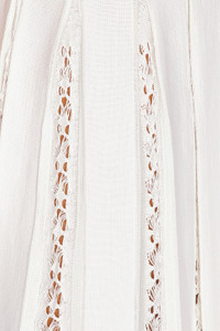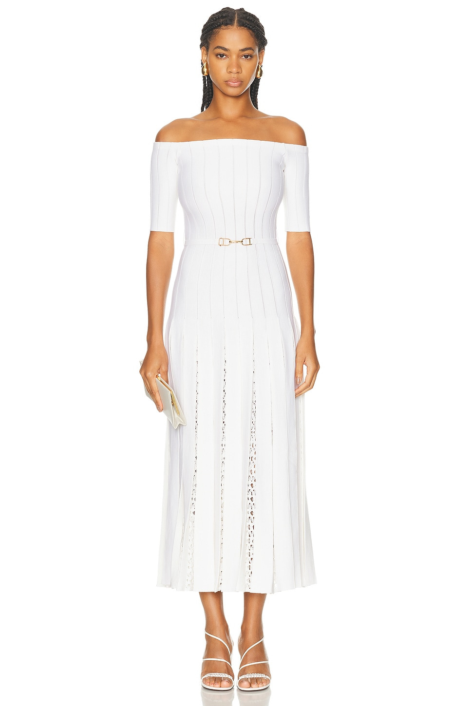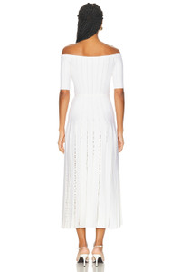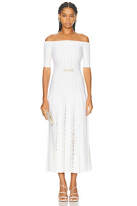 Details - 70% virgin wool, 30% silk - Dry clean only - Unlined - Pull-on styling - Off-shoulder design - Tonal belt with gold-tone hardware accent - Pleated skirt with open crochet detail - Knit fabric - Made in Italy - Our Style No. GABF-WD68 - Manufacturer Style No. 4259138