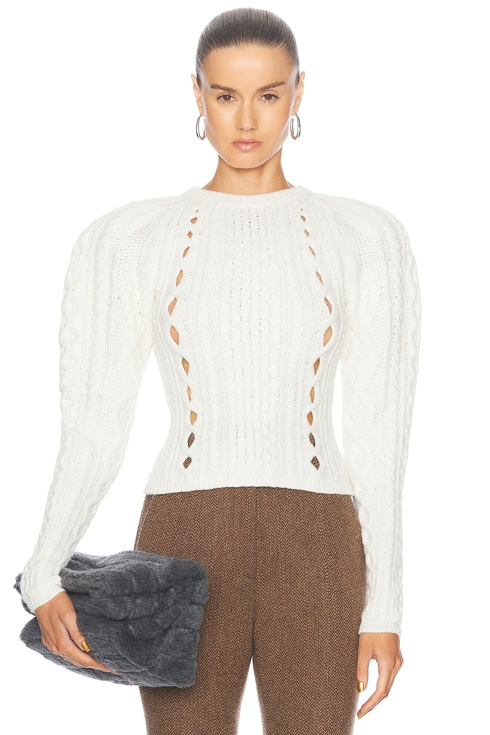 Details - 100% cashmere - Made in Bolivia - Dry clean - Cable knit fabric with padded shoulders - Our Style No. GABF-WK7 - Manufacturer Style No. 1249731-A001
