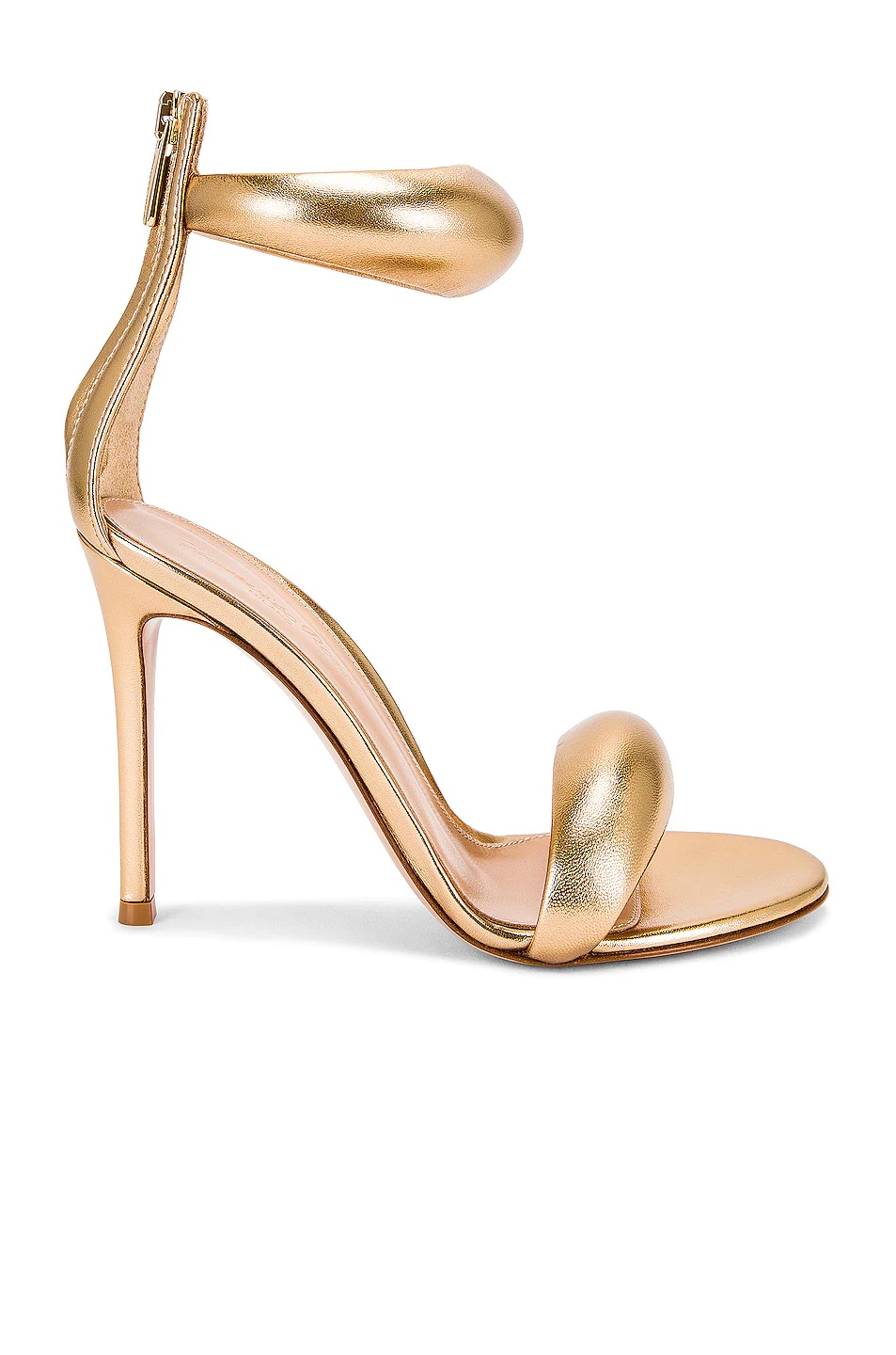 Details - Metallic leather upper with leather sole - Made in Italy - Back zipper closure - Padded straps measure approx 0.75" thick - Approx 100mm/ 4 inch heel - Our Style No. GIAN-WZ533 - Manufacturer Style No. G61635-15RIC-NPS