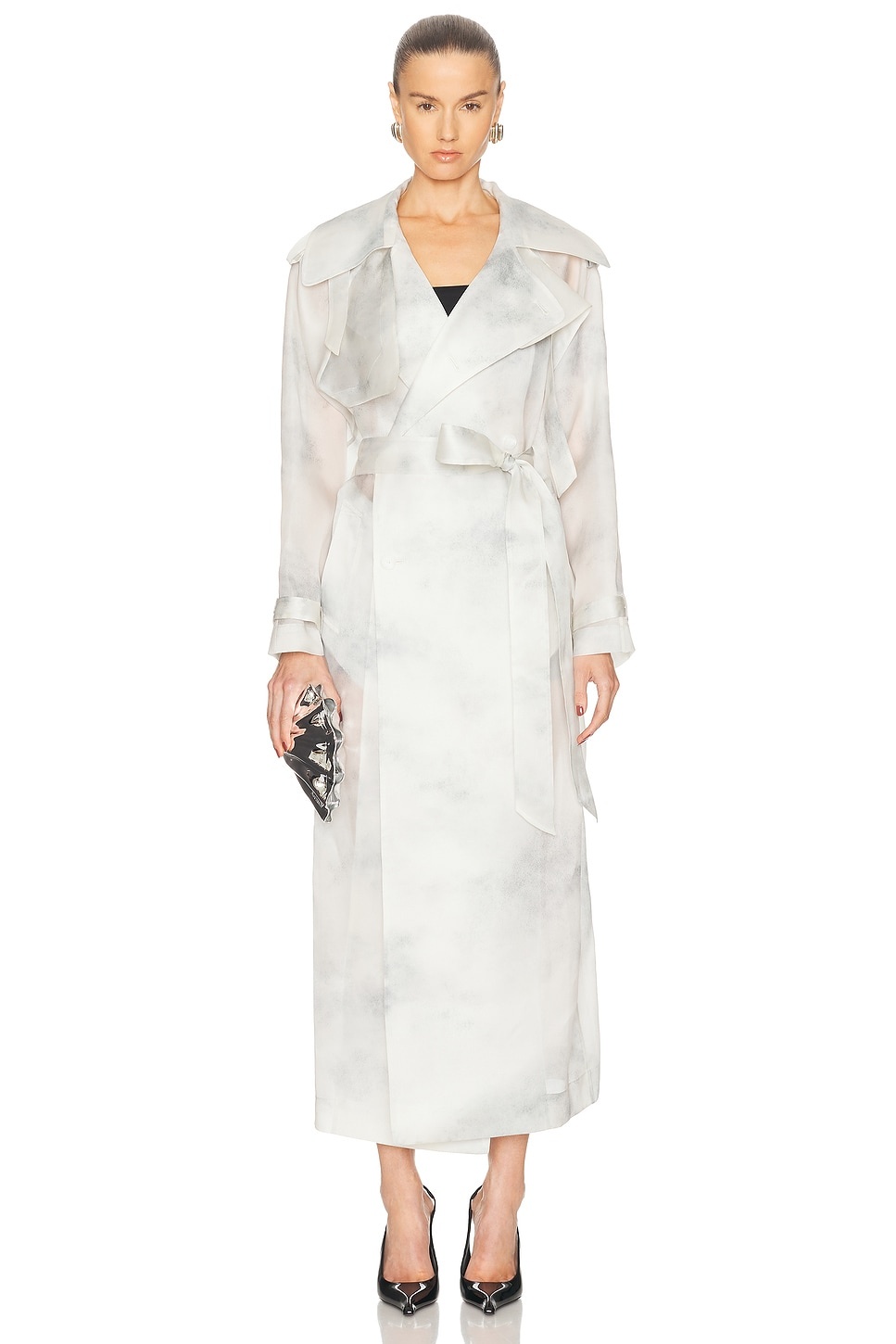 Details - 100% silk - Dry clean only - Front button closure - Front slant pockets - Detachable belt with tie closure - Notched lapel collar - Lightweight organza fabric - Garment is made with a semi-sheer fabric, undergarments can show through - Made in US - Our Style No. GELF-WO1 - Manufacturer Style No. GL-SS25-G6107
