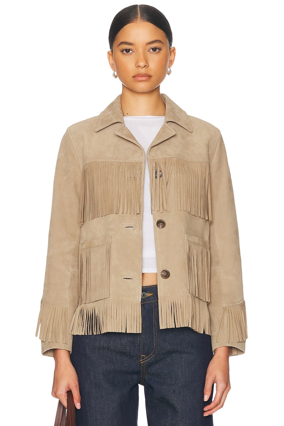 Details - Self: 100% goat leather - Lining: 52% polyester, 48% viscose - Made in China - Professional leather clean only - Front button closure - Front slip pockets - Fringed trim - Notched lapel collar - Heavyweight leather fabric - Our Style No. GRLR-WO123 - Manufacturer Style No. GROW109 S25