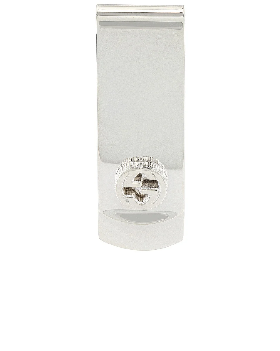 Sterling silver Made in Italy Measures approx 0.75"W x 2.25"H Logo engraved detail and Interlocking G on each side Clip holder Our Style No. GUCC-MA52 Manufacturer Style No. YBF499062001