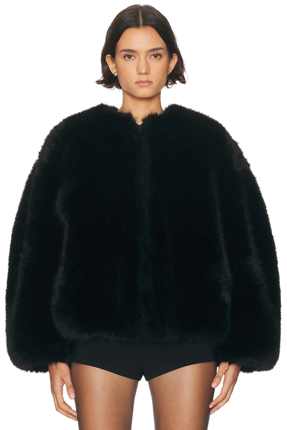 Details - The specialness of this faux fur bomber is all in its sculptural silhouette. Collarless with minimal hardware it feels especially elegant. - Imported - Polyester-textile - Dry clean recommended - Concealed zip up closure - Fully lined sleeves - Concealed side seam pockets - Our Style No. HELO-WO4 - Manufacturer Style No. HAOW10002 H25