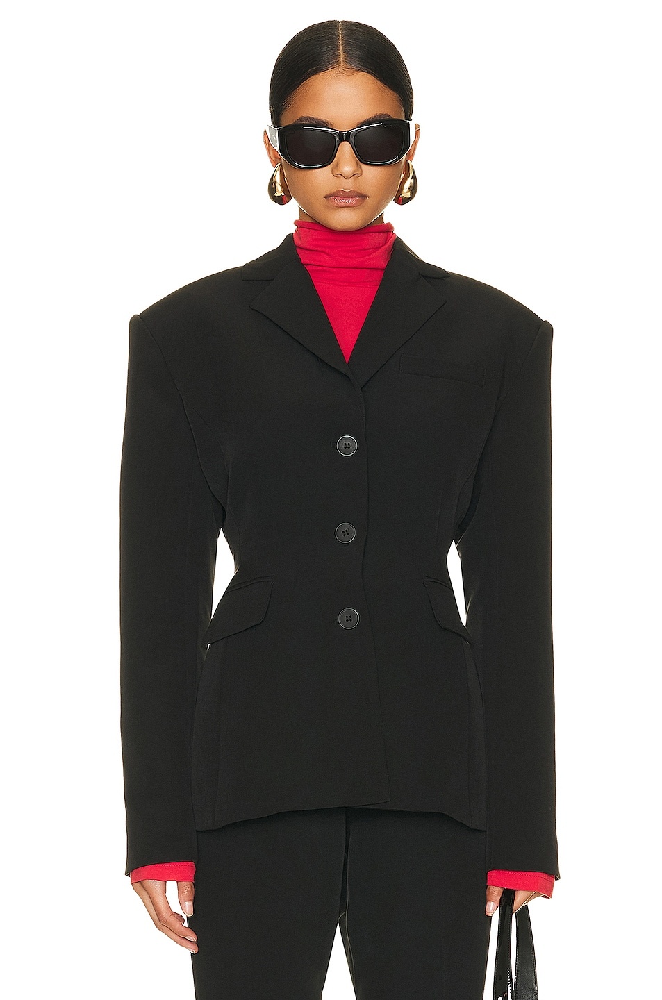 Details - Self: 57% polyester, 36% recycled polyester, 7% spandex - Lining: 55% polyester, 45% viscose - Made in China - Dry clean - Front button closures - Breast welt pocket and front flap pockets - Padded shoulder and buttoned cuff - Crepe twill fabric with darted waist - Item not sold as a set - Our Style No. HLSA-WO10 - Manufacturer Style No. HEOW33 S24