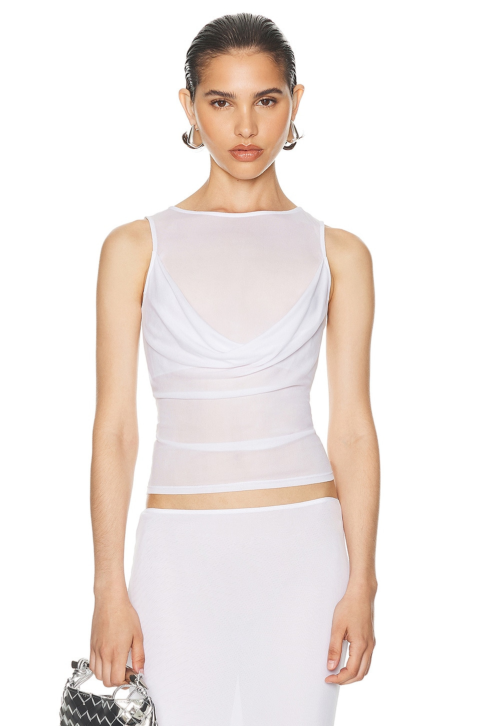 Details - 100% viscose - Made in China - Dry clean - Lined upper - Draped cowl neck - Sheer mesh fabric - Garment is intentionally sheer, undergarments will show through. - Our Style No. HLSA-WS103 - Manufacturer Style No. HES75 S24